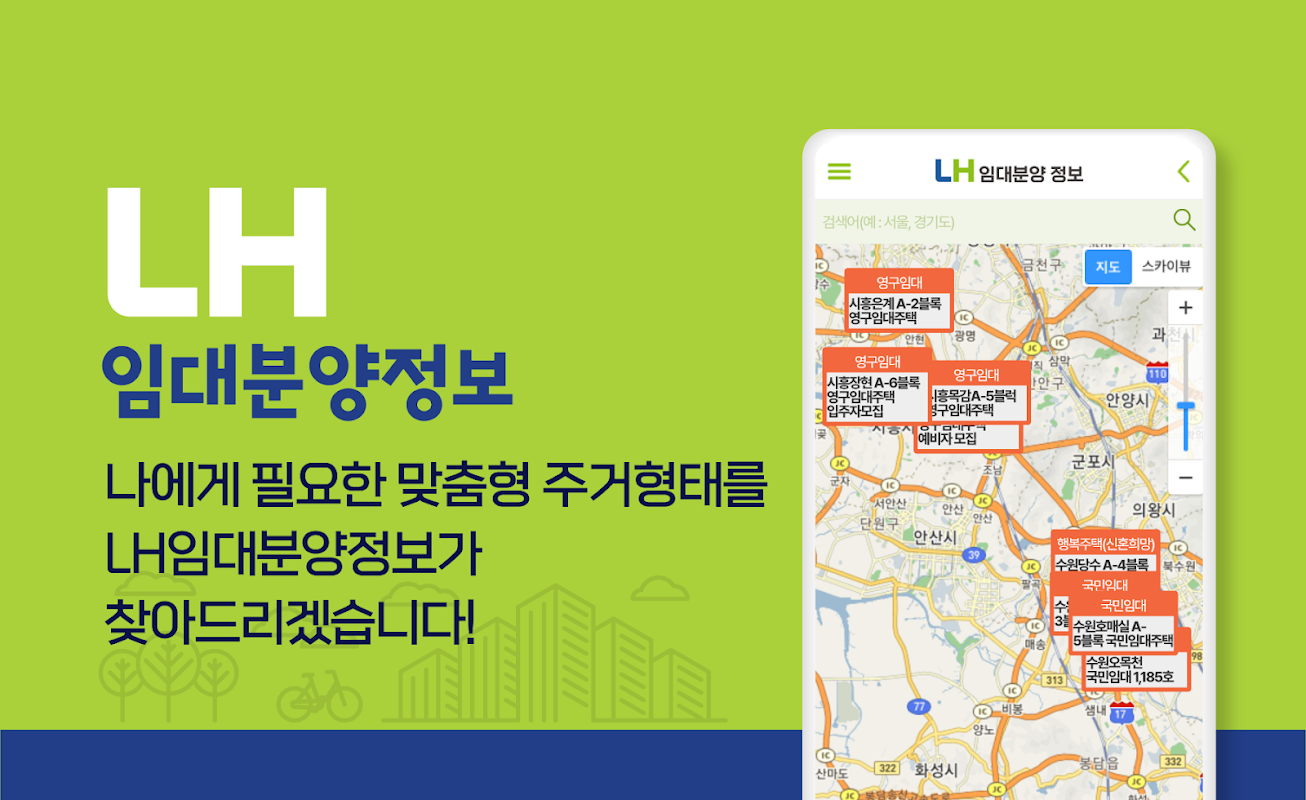 행복주택, 국민임대 등 LH주택공사의 다양한 분양 공고를 지도로 한눈에 확인할 수 있습니다. 지도와 함께 실시간 분양 소식까지 한 번에 확인해 보세요. 2023년도 LH임대분양의 최신 소식과 청약 등 다양한 정보를 LH 임대분양정보 알림서비스 - 행복주택 국민임대 청약에서 간편하게 푸시 알림으로 빠르게 제공해 드립니다.