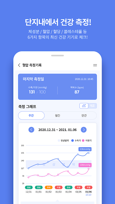 자가건강측정, 개인건강기록 관리, 건강데이터를 활용한 지능형 건강분석 서비스 및 복약 알림 서비스를 제공합니다.