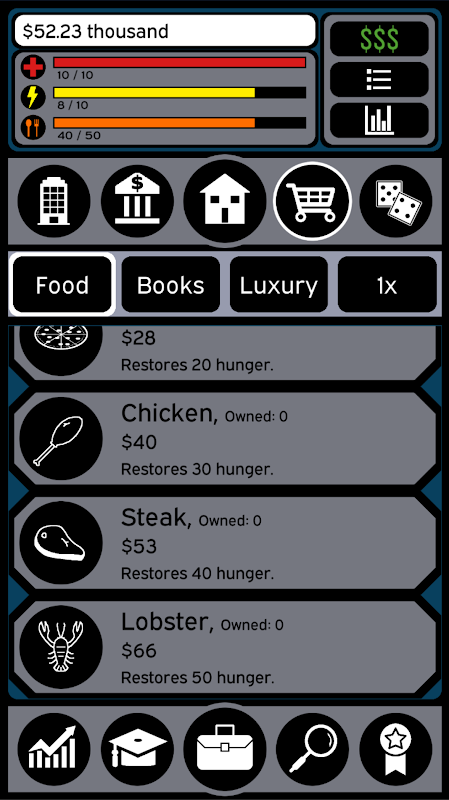 Life Simulator 2 is all about moving up through the world by going to school, getting a job, and eventually running a successful business! Of course, it's also about amassing the most wealth you possibly can. In Life Simulator 2, you can even see how you compare to other players on the leader board and earn achievements based on your progress!