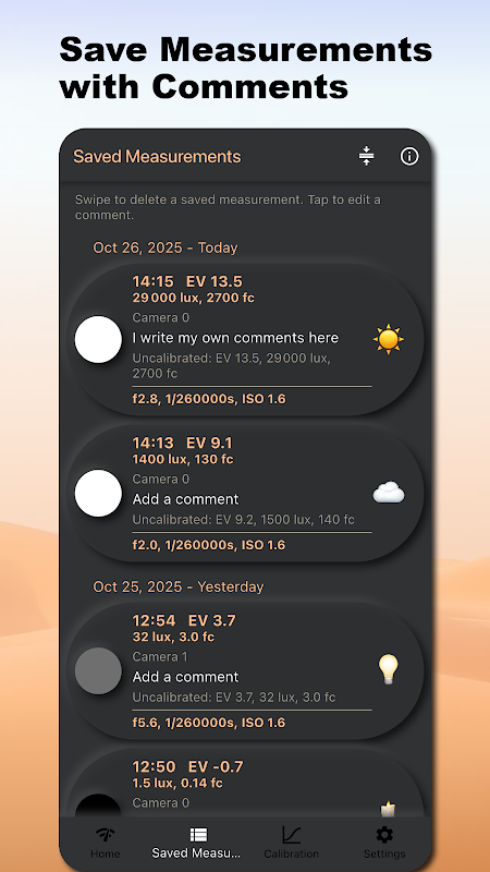 타임스탬프, 커스텀 메모, 완전한 카메라 설정과 함께 무제한 측정값을 저장하여 향후 참조 및 비교에 활용하세요.