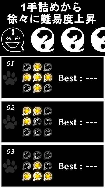 스테이지는 3×3과 4×4의 사이즈가 있어, 각각 50 스테이지씩(합해 100 스테이지) 있습니다. 스테이지를 클리어 해 나가는 것으로, 다음의 난이도가 서서히 해방되어 갑니다.