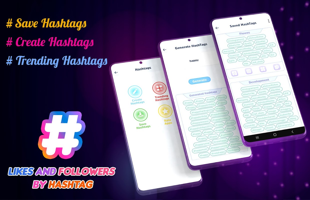 Likes and Followers by Hashtag is an app that makes it simple and quick to get more likes and followers on Facebook, Twitter, and Instagram.