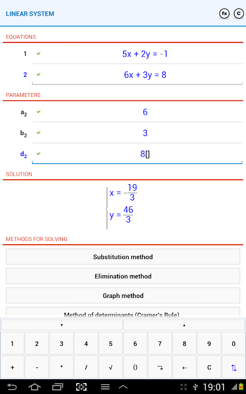 The application solves systems of equations with two or three unknowns. Each solution step by step showing what action has been taken to achieve a result.