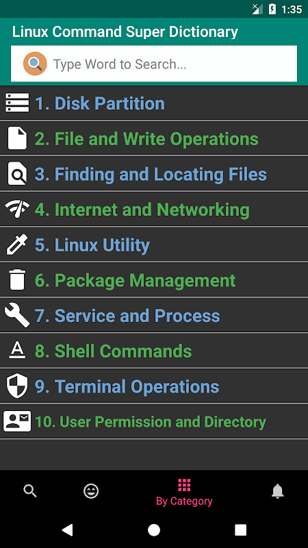이 응용 프로그램은 명령을 다른 범주 (인터넷 및 네트워크, 터미널 작업, 서비스 및 프로세스, 사용자 권한 등)로 분류합니다. 따라서 작업 요구에 따라 새 명령을 쉽게 배울 수 있습니다.