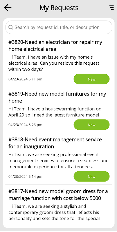 요청 게시: 사용자는 필요한 다양한 서비스, 작업 또는 지원에 대한 요청을 쉽게 작성하고 게시할 수 있습니다. 자세한 설명을 제공하고, 요구 사항을 지정하고, 파일이나 미디어를 첨부하고, 더 나은 가시성을 위해 요청을 분류할 수 있는 유연성이 있습니다.