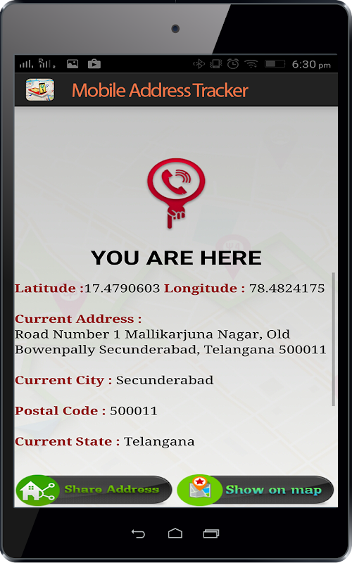 ► Mobile address Location Tracker is small tool through which you can easily track all the current locations. Its a very simple and unique app that helps you to track your own live locations on GPS MAP and in text format.