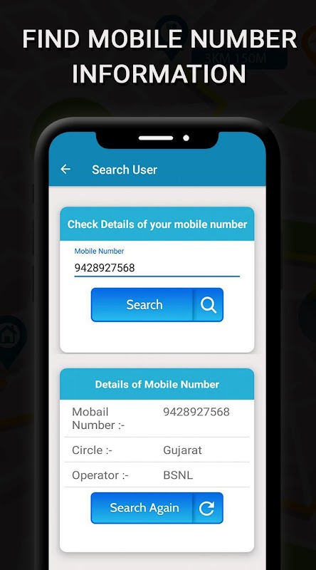 Phone number Tracker application helps you to track any phone number from India. You can search for any mobile number to find the contact name and the location. The city area, state, country and service operator of the phone number will be displayed and the geographic location will be shown on the maps.