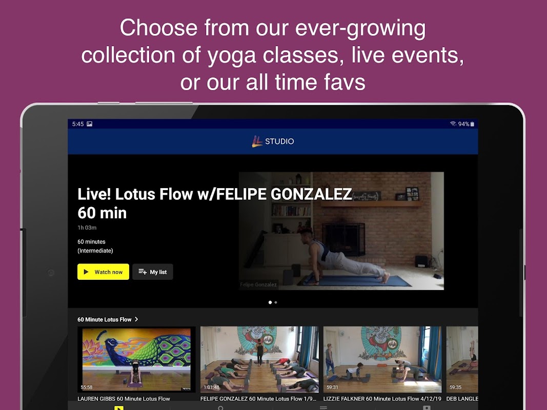 집이나 이동 중에 좋아하는 선생님과 함께 연습하십시오. 끊임없이 증가하는 요가 수업, 라이브 이벤트 또는 항상 선호하는 컬렉션 중에서 선택하십시오. 숙련 된 요기뿐만 아니라 새로운 실무자를 위해 특별히 선별 된 학급 서비스를 즐기십시오.