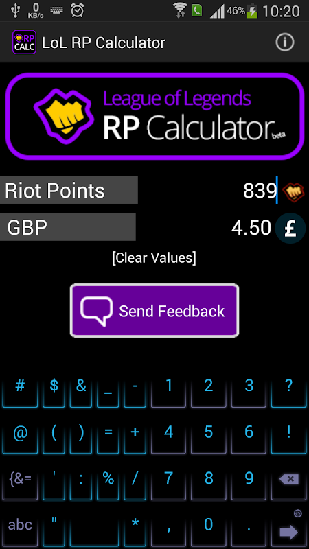 LOL RP 캘크 작은 응용 프로그램입니다, 그리고 전설의 이상적인 동반자 게임 리그이다. 그것으로, 당신은 쉽게 많은 RP 및 전설적인 모양을 요할지, 반대로 주어진 시간에 구입, 또는 수의 RP의 양을 계산할 수 있습니다. 그냥 값을 기록, 당신은 즉시 자신의 통화 변환을 얻을 것이다.