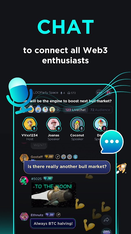 기능 2 - LOOP Space: 문자 채팅과 음성 채팅을 모두 지원하여 글로벌 트렌드에 대한 최신 정보와 참여를 유지합니다. 매일 LOOP SPACE에서 활동하는 인플루언서들과 함께 세상은 잠들지 않으며 항상 새롭고 흥미로운 발전으로 가득 차 있습니다.