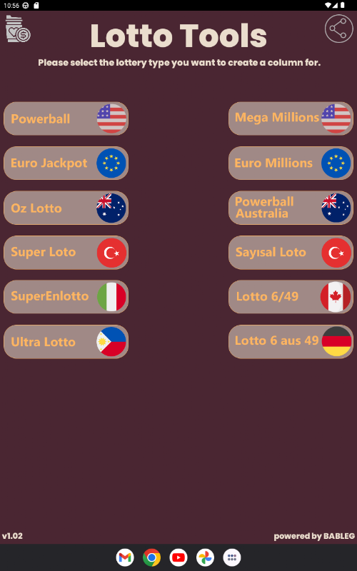 로또 도구로 복권 잠재력을 발휘해보세요! Powerball, Mega Millions, Euro Jackpot, EuroMillions, Oz Lotto, Powerball Australia, Super Loto, Sayısal Loto, Super En Lotto, Lotto 6/49, Ultra Lotto, Lotto 6 aus 49, French Loto, Belgium Lotto 등을 위해 설계되었습니다. 우리 앱은 복권을 생성하는 다양한 방법을 제공합니다: