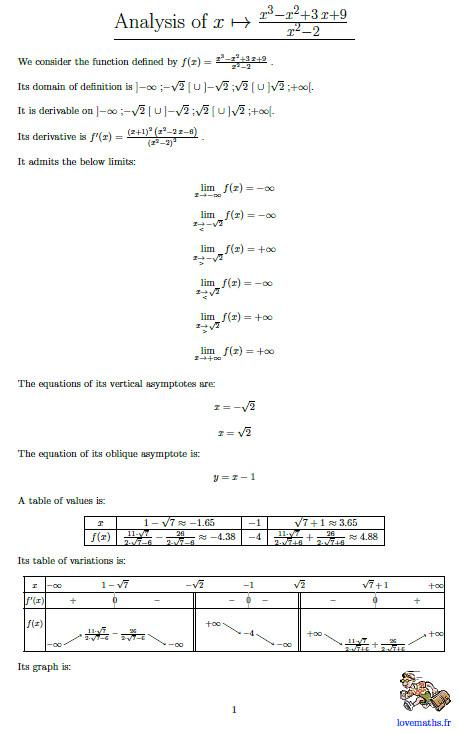 기능 연구의 경우 기능, 예 : ln (3x ^ 2-1), 첫 번째 텍스트 상자에 지정해야합니다. 연구 간격도 선택적으로 제공 될 수 있습니다 (예 : [3; + ∞ [)). 그런 다음 "Go!"를 클릭하면 분석이 수행됩니다 (정의 영역, 미분, 한계, 점근 방정식, 변동 테이블, 그래프). 결과는 PDF 파일입니다. 인터넷 접속이 필요합니다. 잘못된 기능 또는 간격을 입력하거나 인터넷 연결을 시도하는 동안 문제가 발생하면 설명이 포함 된 오류 메시지가 표시됩니다.