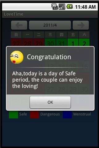 LoveTime is a tools application which runs on the Android system .When user input the need data,it will calculate the safe period of menstruation.Then it can tell you which day is safe,which day is dangerous and which day is menstrual day.Wish you like it.