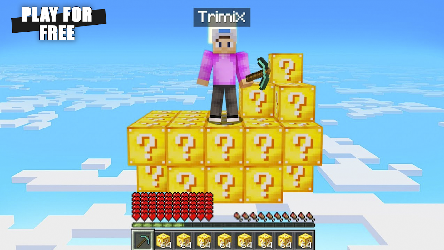 Minecraft Pocket Edition용 Lucky Block 모드는 MCPE 세계에 스카이블럭을 추가하여 서사적인 아이템과 스킨으로 지도에서 제작하여 섬과 생물 군계를 탐험합니다.