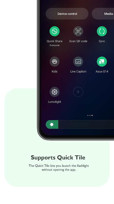 사용자가 선택한 일부 정적 색상을 밝게 하고 표시하여 화면을 전면 플래시로 사용하고 손전등을 토치 모드로 사용합니다. 앱을 열지 않고도 전면 플래시를 사용할 수 있고, 볼륨 키를 사용해 밝기를 조정할 수 있는 '타일 지원'도 있습니다.