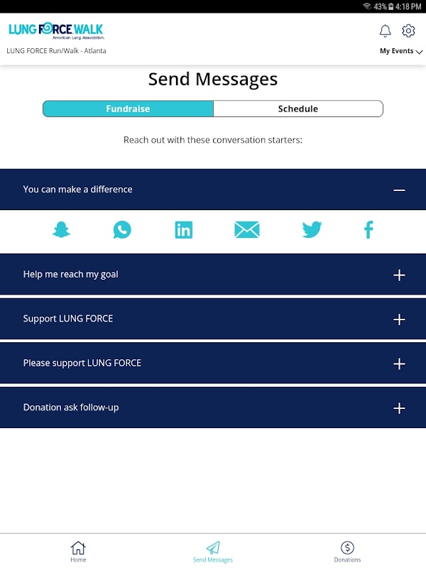 LUNG FORCE 모바일 앱으로 이동 중에 모금 및 교육을 수행하십시오. 페이지를 업데이트하고, 이메일을 보내고, 모금 진행 상황을 확인하고, Google 피트니스에 연결하여 신체 활동을 추적하세요.이 모든 것이 손바닥에서 가능합니다.