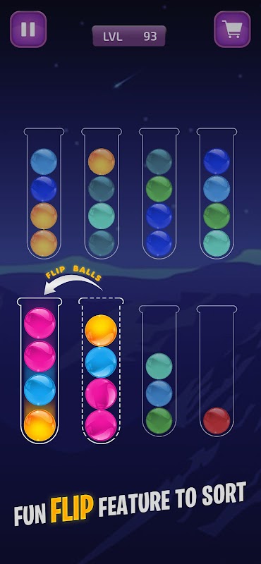 - Flip Tube: Magic ball sorting challenge has flip tube feature. By using this feature user can shuffle balls in any selected tube. By shuffle balls in single tube user can easily sort colors and complete levels.