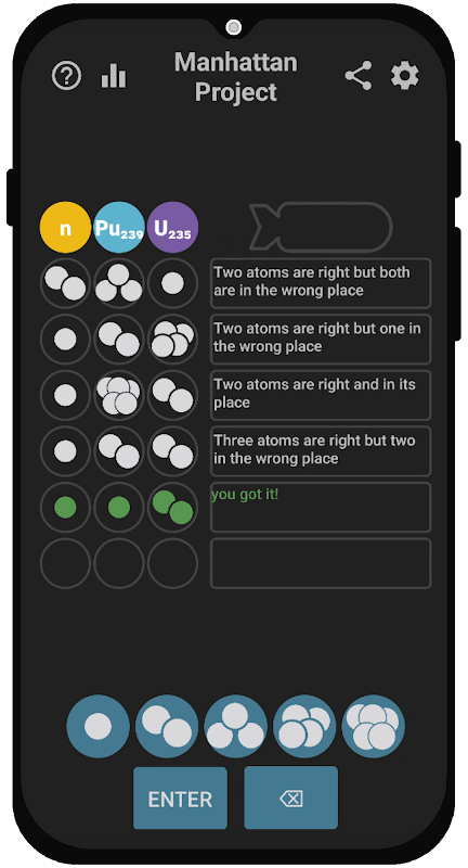 이 게임은 원자 폭탄을 만들고 게임에서 이기는 유일한 유효한 솔루션을 구성하는 3개의 원자 번호(1에서 5 사이)를 추측하는 것으로 구성됩니다.