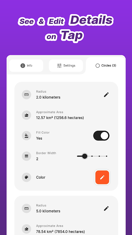 - 사용자 지정 도형 그리기: 원하는 위치에 동심원과 다면체를 만들 수 있습니다. 지도에서 구역을 정의하고, 경계를 표시하고, 관심 지역을 계획하는 데 이상적입니다.