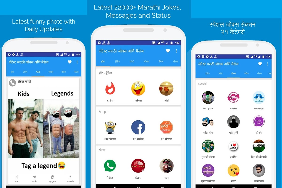 With more than 22000+ Jokes,messages, status, DP status and funny photo. it contains the largest collection of Marathi jokes. Along with this there are 65 different categories, which is as follows: