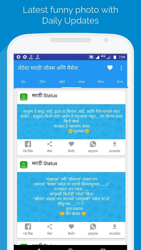 This App contains all kinds of Marathi Language Jokes, Message, status, and Funny DP status, funny photo, and Famous Facebook Pages. If you are feeling bored or having sad day just read this jokes and make yourself happy. You can also share this messages with social networking.