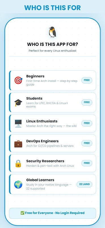Arch Linux 튜토리얼은 처음부터 Arch Linux를 배우는 데 필요한 모든 것을 갖춘 완벽한 무료 광고 없는 앱입니다. 완전 초보자부터 Linux 커스터마이징, 커널 튜닝, 서버 관리까지 깊이 파고드는 고급 사용자까지, 이 앱은 언제 어디서든 원하는 언어로 이용할 수 있는 최고의 Linux 가이드입니다.
