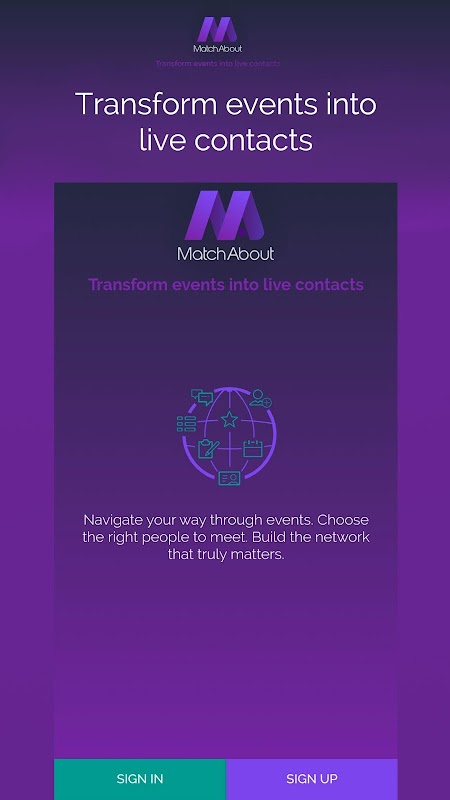 MatchAbout은 제한없이 이벤트 간 및 이벤트 간 네트워킹을위한 쉬운 방법입니다. 끝나지 않는 이야기. 일단 앱에 가입하면 이벤트마다 연락처, 자료 및 기타 귀중한 물건을 수집 할 수 있습니다. 또한 한 곳에서 모든 것을 안전하게 보관하십시오. 이벤트에 집중하고 싶거나 트랙에 머물기를 원한다면, 이것이 당신에게 맞는 곳입니다. 우리는 항상 일의 근원에 있기 때문에 우리의 사명은 사건을 실제 삶의 기회로 바꾸는 것입니다!