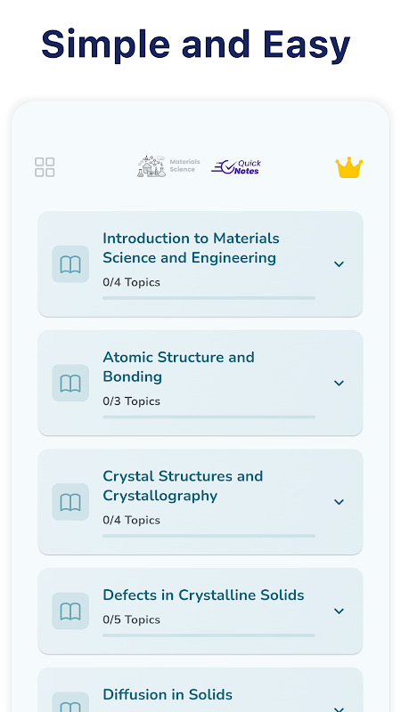 • 포괄적인 주제 범위: 원자 구조, 결정학, 기계적 특성 및 재료 테스트와 같은 주요 개념을 학습합니다.