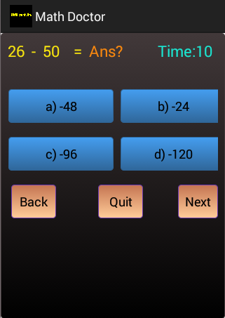 In this application there are two levels level1 and level2.In level2 there is less time to decide answer.in this advance math game + there is question with four answers ,user has to select any one answer then message will come saying that selected answer is right or wrong. If user unable to calculate answer in specified time limit then at last there message will appear with correct answer.