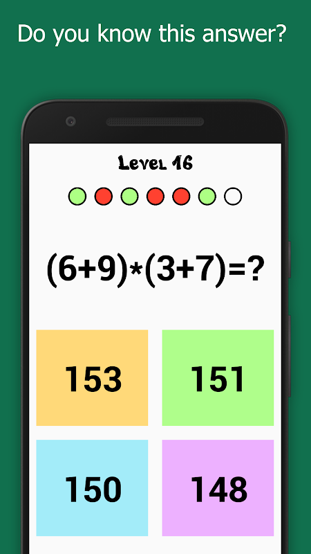 2 game modes: Passage - a set of 18 different levels with problems in mathematics, addition, subtraction, addition, multiplication, different priorities for action. Quick Play - a game in which you have to think fast. The purpose of a quick game - the most correct and most rapid solution of problems in mathematics in the allotted time. You can compete with your friends and classmates at school. Who better to know math?