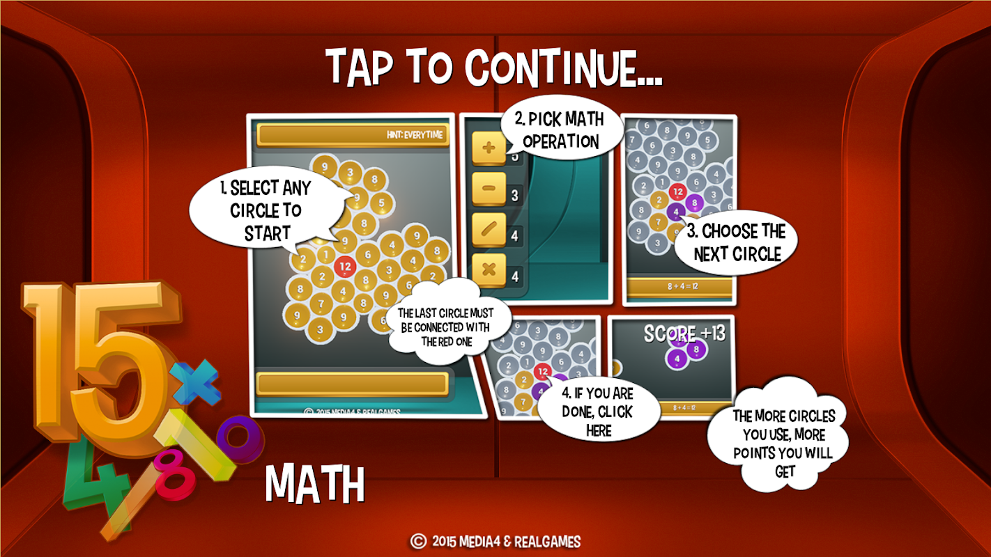 Touch numbers and choose the operations to solve a given number that is displayed in a red circle. Simple rules, and great casual gameplay. The number in the red circle is the one you should try to reach by using limited number of operations and available numbers. The trick is that all of the selected circles must be bordering, and the last selected has to be bordering with the red one. More solutions you have, more points you will get!