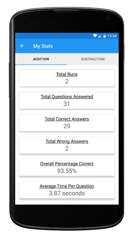 지금까지의 모든 수학 경주의 통계 개요. 당신은 또한 질문 당 취하거나 최고의 뺄셈 실행 이제까지 무엇 평균 시간 (초)을 알고 싶으십니까? 걱정하지 마세요, 수학 레이스 응용 프로그램은 당신이 덮여 가지고있다.