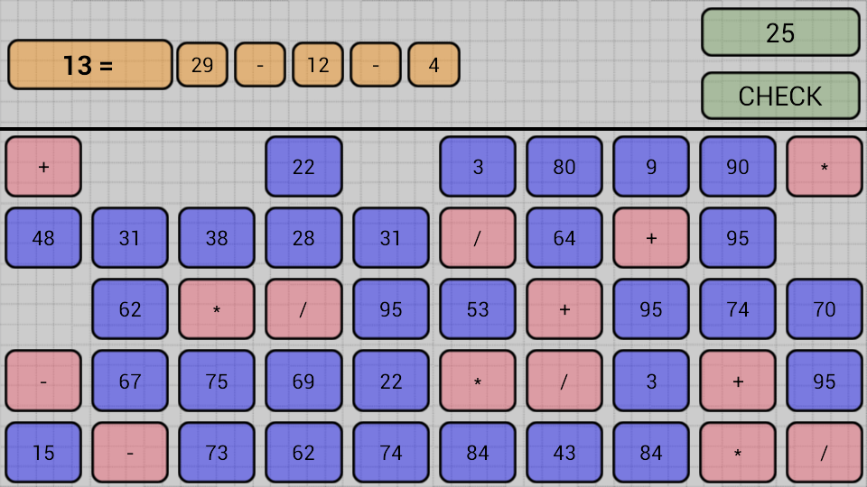 The rules are simple. You have random destination number and a lot of number from 1 to 100, from those numbers You need to create equation to get your destination number. You can create maximum of 4 operation on those numbers.