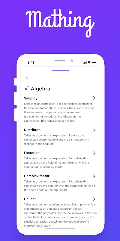 Mathing CAS is on par with HP Prime and Texas Instruments TI-84. Compute prime numbers, apply trigonometric transformations, factorise expressions, integrate and differentiate, generate polynomials based on roots and much more.
