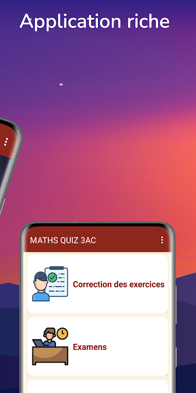 귀하는 3학년(모로칸 시스템) 또는 3학년(프랑스어 시스템) 에 재학 중인 대학생이며 시험 중에 더 많은 점수를 받기 위해 수학 실력을 향상시키고 싶습니까? 대학생들을 위한 멋진 수학 게임과 퀴즈를 갖고 싶으신가요? 당신은 바로 이곳에 있습니다. Math Quiz 3AC는 대학생을 위해 설계된 무료 수학 퀴즈 게임입니다! 각 수업에 대한 도전적인 퀴즈 외에도 수학 수업 요약을 제공합니다. 원하는 카테고리를 선택하고 게임을 시작하고 레벨을 올리세요!