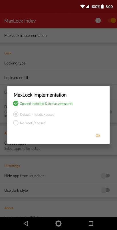 MaxLock is an applocker based on the Xposed Framework. Unlike most other applockers, it uses a battery friendly and efficient event recognition method instead of a polling service.