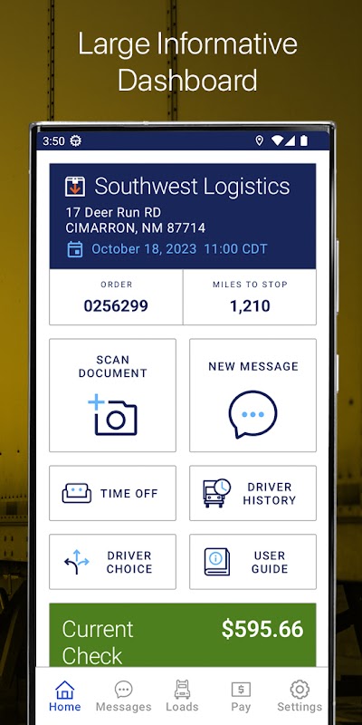 홈 화면에서 현재 할당 카드는 운전자를 환영하고 적재 세부 정보, 정류장 정보, 약속 세부 정보 및 다음 정류장까지의 마일리지를 제공합니다. 카드 아래에 보이는 버튼을 통해 운전자는 문서를 스캔하거나, 새 메시지를 작성하거나, 휴가를 요청하거나, 운전자 기록 보고서를 실행할 수 있습니다. 운전자는 가장 최근의 정산 세부 정보를 검토할 수 있습니다. 사용자 지정 링크를 사용하면 홈 오피스에서 직원 커뮤니케이션, 안전 비디오, 벤더 파트너 링크, 혜택 제공자 등에 대한 링크를 관리할 수 있습니다.