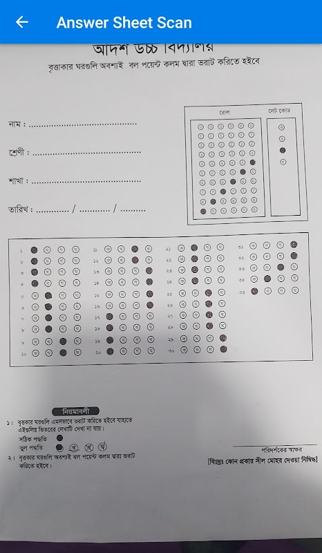 OM OMR 섹션에서 선생님은 먼저 시험을 선택하고 OMR Answer Sheet의 휴대 전화 카메라를 잡습니다. 그러면 교사는 Student OMR Answer Sheet를 볼 수 있습니다.