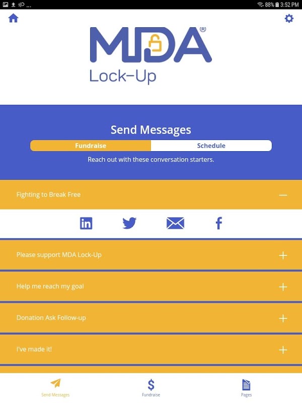 This app is designed to help business leaders who have agreed to be Jailbirds in the Muscular Dystrophy Association Lock-Up event. Jailbirds can monitor their progress and request donations toward their "bail" from their business associates, friends and family, all to help in the fight against muscle disease.