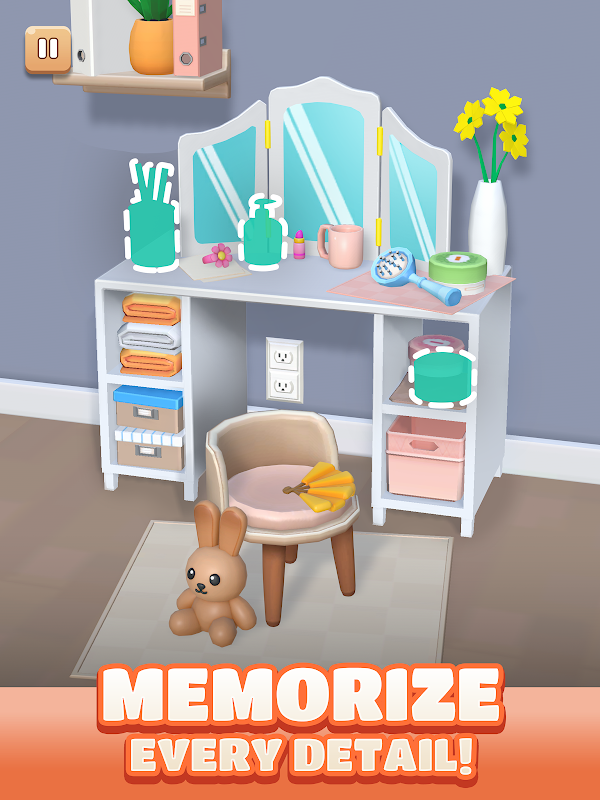 각 레벨마다 정성껏 배치된 아이템으로 가득 찬 새로운 방이 나타납니다. 준비가 되면 여러 개의 물건이 사라집니다. "+" 아이콘을 탭하고 올바른 물건을 골라 제자리에 정확히 놓으세요. 예리한 눈과 강한 기억력만이 당신을 승리로 이끌 것입니다.