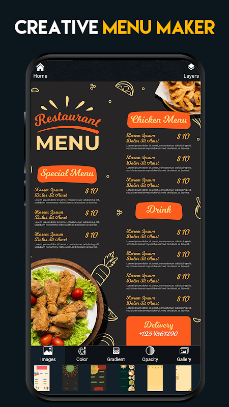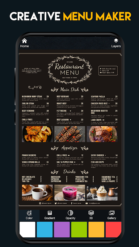메뉴 메이커 앱은 제품 및 서비스 목록이 있고 창의적인 방식으로 고객에게 보여주려는 모든 비즈니스에 유용합니다. 메뉴 디자인을 빠르게 만들고 싶은 그래픽 디자이너에게도 유용합니다.