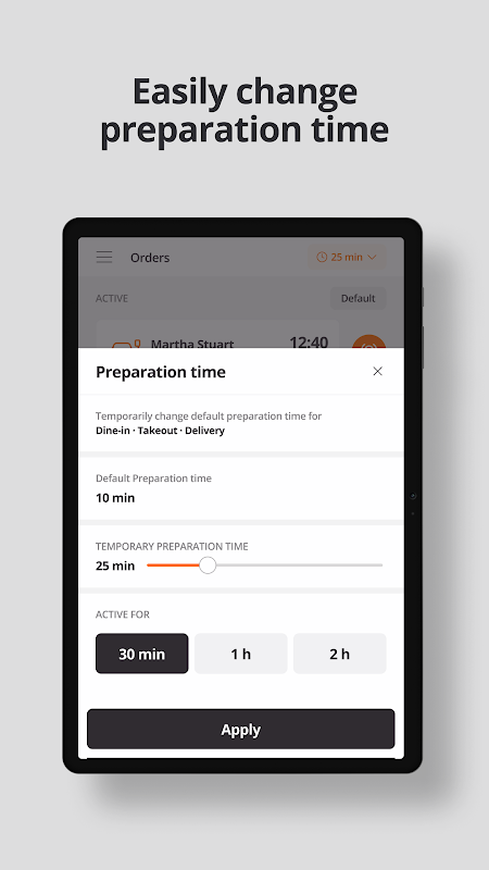 MENU 태블릿 앱을 사용하면 식당 직원이 활성 주문 및 예정된 주문 목록을 추적하고, 주문을 픽업할 준비가 되면 고객에게 알리고, 주문을 지연 또는 취소하고 환불할 수 있습니다. 또한 레스토랑 직원은 콘텐츠 관리 시스템을 사용하지 않고도 메뉴 항목, 콤보 및 수정자 가용성을 빠르게 변경하고 매장의 평균 식사 준비 시간을 업데이트할 수 있습니다. 모든 내부(모바일 앱, 키오스크 및 웹 앱) 및 외부(애그리게이터) 채널의 주문은 이 단일 태블릿 애플리케이션을 사용하여 관리됩니다.