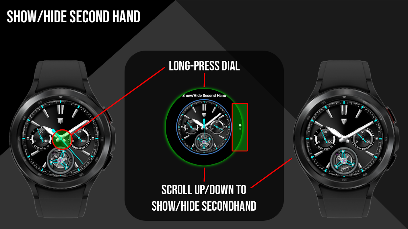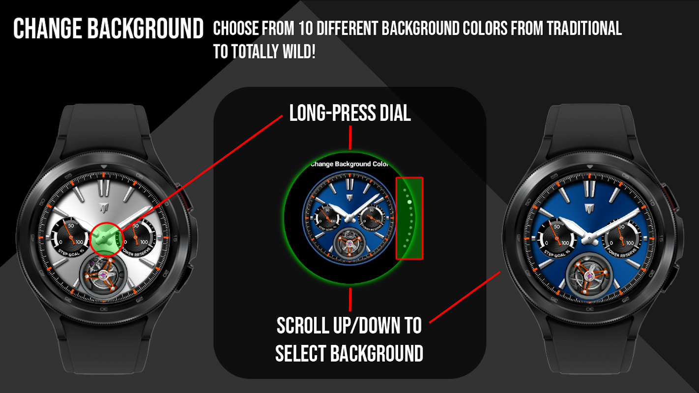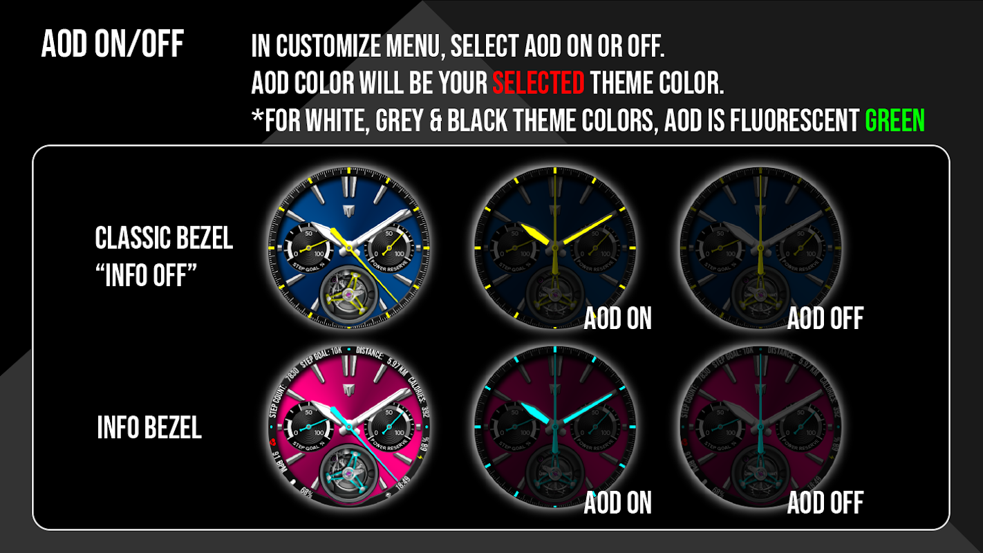 이것은 아름답고 초현실적이며 완전히 처음부터 그려졌습니다. Wear OS용으로 제작된 뚜르비옹 무브먼트 시계 모드는 전통적인 트림 색상으로 제공됩니다. 대담한 느낌이 든다면 일부 와일드 색상도 사용할 수 있을 뿐만 아니라 마음껏 맞춤 설정할 수 있는 옵션도 있습니다. 이 시계 모드의 또 다른 특징은 외부 베젤에 표시되는 상태, 단계 및 정보 표시를 켜거나 끄는 기능으로, 클래식 뚜르비옹을 사용하거나 좀 더 현대적인 기능을 하나의 시계 모드에 모두 포함할 수 있는 옵션을 제공합니다.