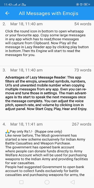 요즘에는 소셜 미디어 앱, 뉴스 앱, 채팅 앱, 도서 앱, 블로그, 웹 페이지 등과 같은 많은 앱에서 매우 긴 메시지를 받게됩니다.이 앱은 이러한 메시지를 읽어줍니다. 이 앱에서 해당 메시지를 복사하고 재생하기 만하면됩니다.