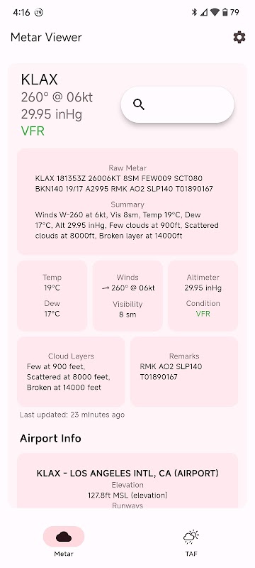 Metar Viewer는 간단하고 제 역할을 수행하도록 설계된 항공 기상 앱입니다. 정확하고 읽기 쉬운 METAR, TAF 및 공항 정보를 제공합니다.