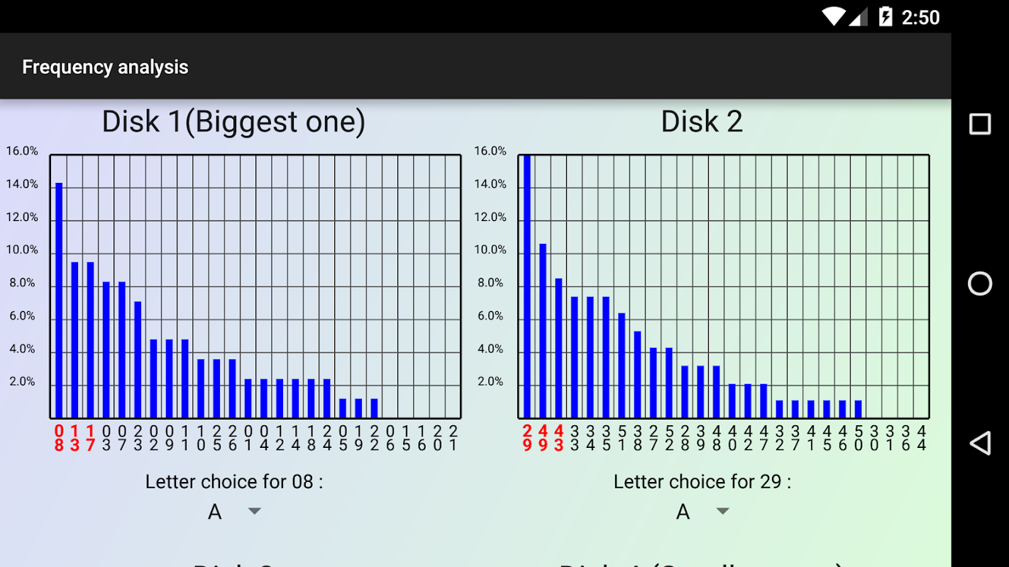 당신은 암호화 방법 및 메시지를 해독하고 각 디스크에 대한 주파수 분석을 표시 할 수 있습니다.