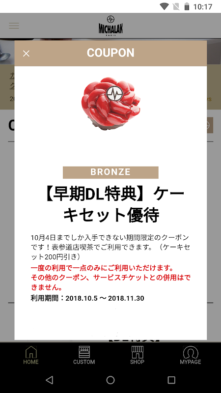 파리에서의 최신 스위트 '코스 믹'을 커스터마이즈 할 수있는 파리의 제과점 '미샤라쿠 "의 공식 애플 리케이션. 유익한 쿠폰도 전달 중입니다.