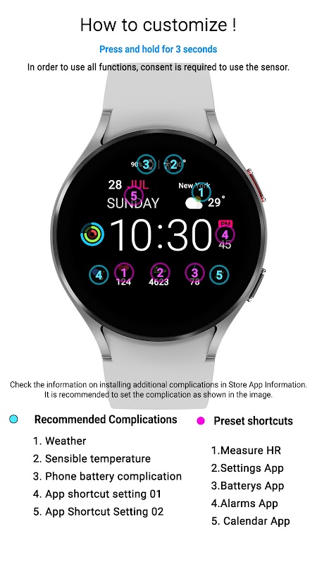 1. 시계 모드 길게 누르기 > 2. 장식 버튼 클릭 > 3. 각 컴플리케이션 영역을 눌러 해당 정보 설정 > 4. 확인 클릭