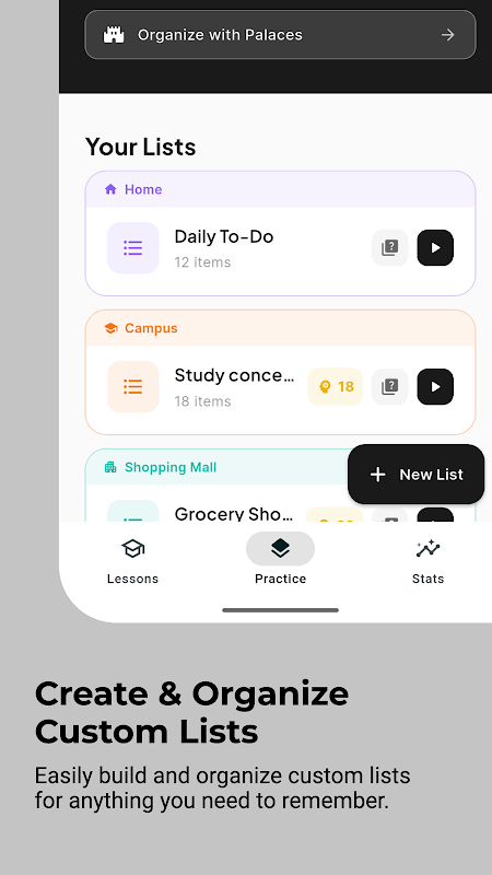 🚀 Start Instantly: New users now begin with a pre-built Memory Palace and sample list. Jump straight into training without any setup!