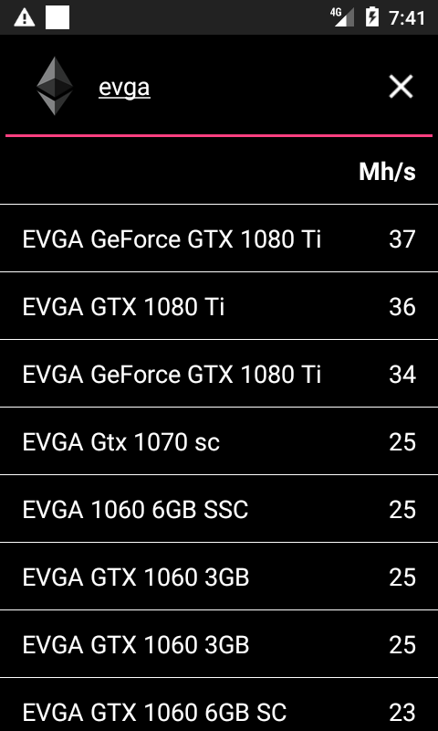 에테 리움 광산 GPU, 광업 Hashrate 목록